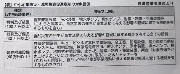 中小企業防災・減災投資促進税制の対象となる設備は【下表】に該当するもののうち、計画の認定を受ける際に目標の達成及び内容の実現に資するものであることの確認を受けた設備です。