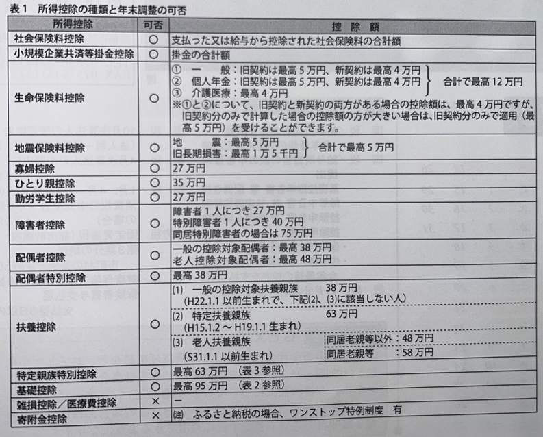 給与所得控除後の給与等の金額を計算した後、社員から提出された各種申告書の内容を基に、所得控除の額(下表1参照)と課税所得金額を計算します。課税所得金額に所得税率を乗じて年調所得税額を算出し、さらに年調所得税額に102.1%を乗じて年調年税額を計算します。