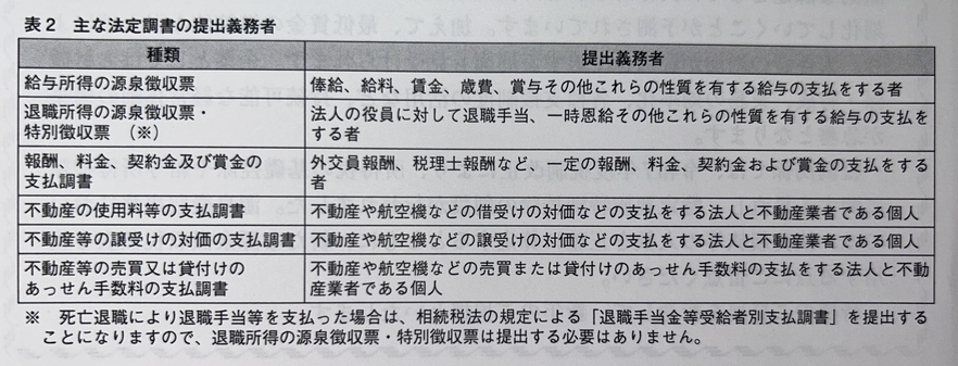 法定調書は、所得税法や相続税法、租税特別措置法などの規定により提出が義務付けられている資料で、「給与所得の源泉徴収票」や「報酬、料金、契約金及び賞金の支払調書」、「不動産の使用料等の支払調書」など、63種類の法定調書があります。主な法定調書の提出義務者は、表2の通りです。