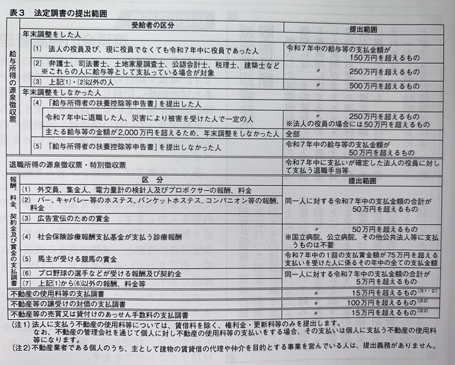 これらの法定調書の提出期限は、「退職所得の源泉徴収票・特別徴収票」を除き、令和8年2月2日です。「退職所得の源泉徴収票・特別徴収票」は、退職の日以後1か月以内が提出期限ですが、税務署への提出分は、他の受給者の分を取りまとめて翌年1月31日(令和7年分は令和8年2月2日)までに提出することも認められています。