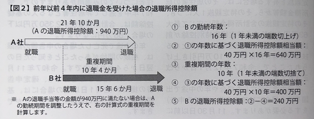 具体的には、本年分の退職手当等の勤続年数に基づいて算出した退職所得控除額から、勤続期間が重複している期間の年数に基づいて算出した退職所得控除額相当額を控除した残額になります(※)。【図2参照】